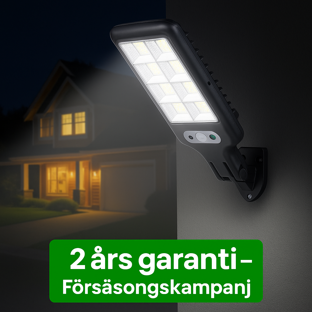 Solljuslampan drivs helt av solenergi och tänds automatiskt när det blir mörkt. Den laddas under dagen – även på molniga dagar – och ger stark belysning på kvällen. Med tre olika ljuslägen och inbyggd rörelsesensor får du både trygghet och flexibilitet. Lampan är vattentät (IP65), enkel att montera utan kablar och byggd för att tåla nordiskt klimat. Perfekt för garage, trädgård, gångvägar och entréer.
